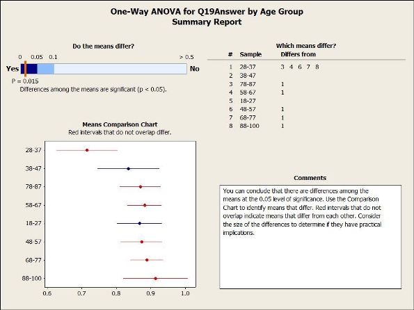 팀은 Minitab 보조 도구 메뉴를 사용하여 설문 점수가 낮은 환자 집단을 식별하기 위한 최적의 분석을 쉽게 선택할 수 있었습니다. 또한 팀은 상기 ANOVA를 통해 연령 집단별 표준 응답 간 통계적으로 유의미한 차이를 확인할 수 있었으며, 이러한 결과를 기반으로 해당 대상에게 개선 노력을 집중할 수 있었습니다.